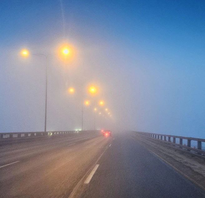 Осадки преимущественно в виде снега и мокрого снега. У воды ранним утром образовался плотный туман – фото сделано на КАД.