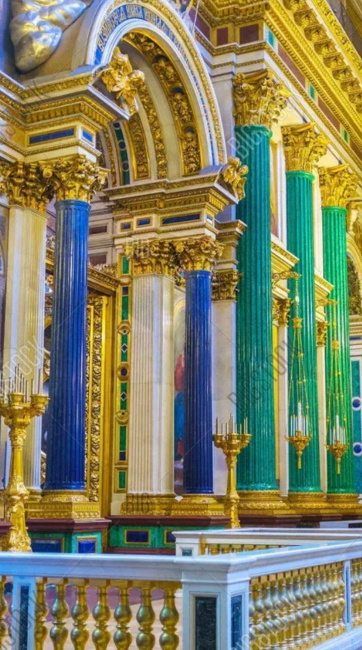колонны из малахита были созданы с использованием техники «русской мозаики»: тысячи тонких плиток, приклеенных на деревянную основу, создавая иллюзию монолитной породы.