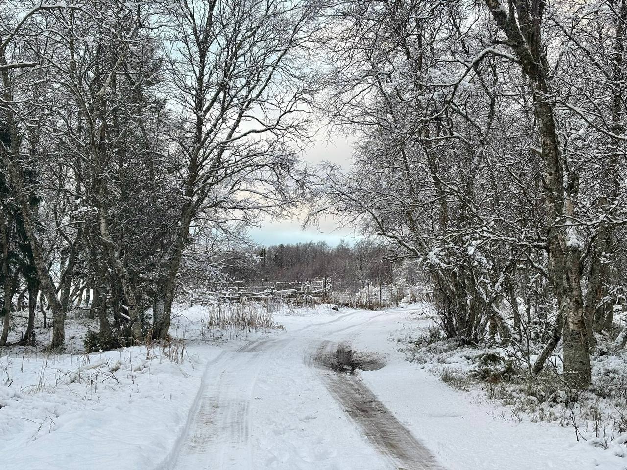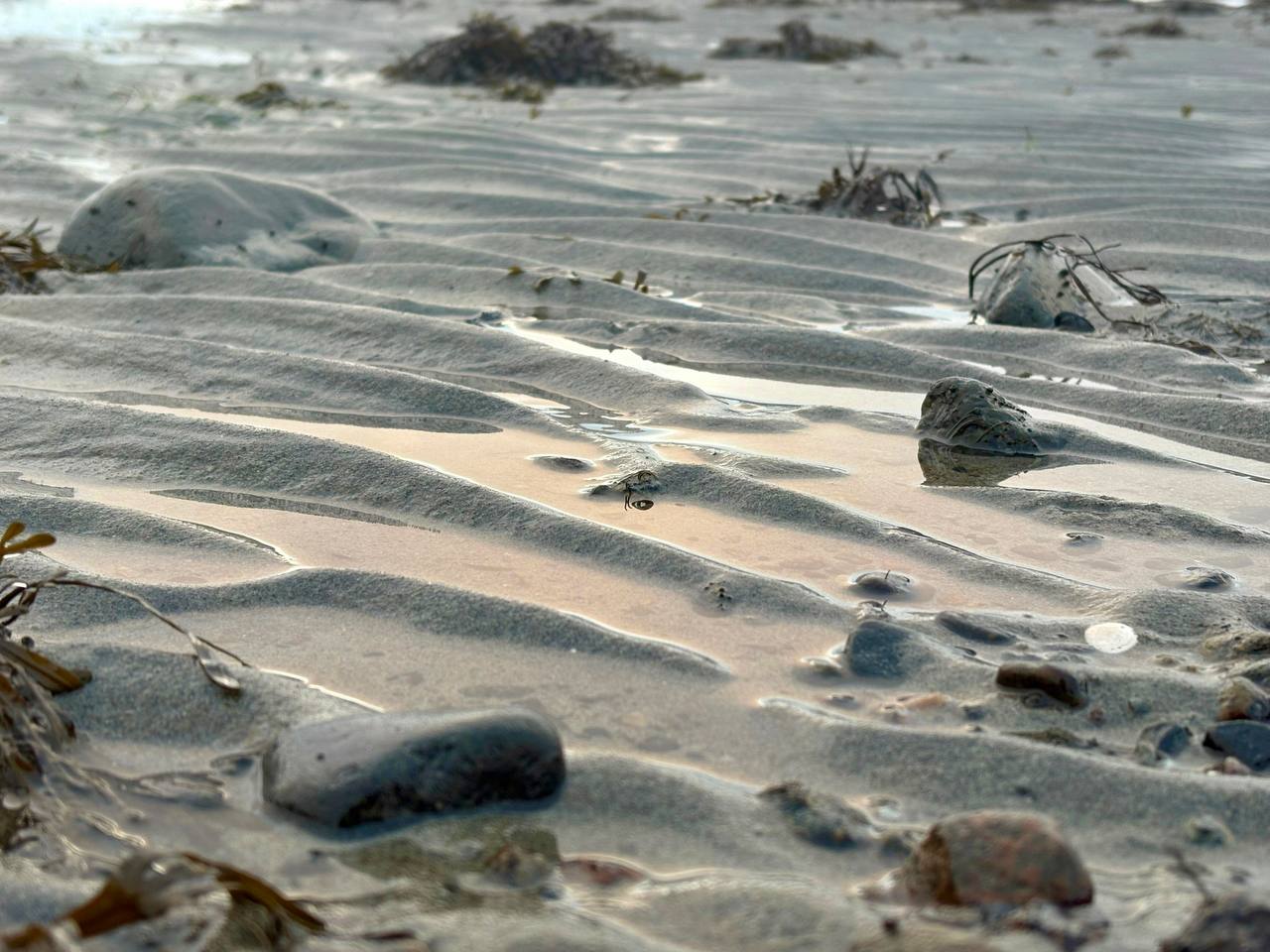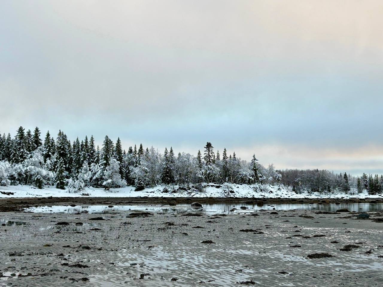 лес в снегу и мокрый песок. Это вода отступила на время отлива.