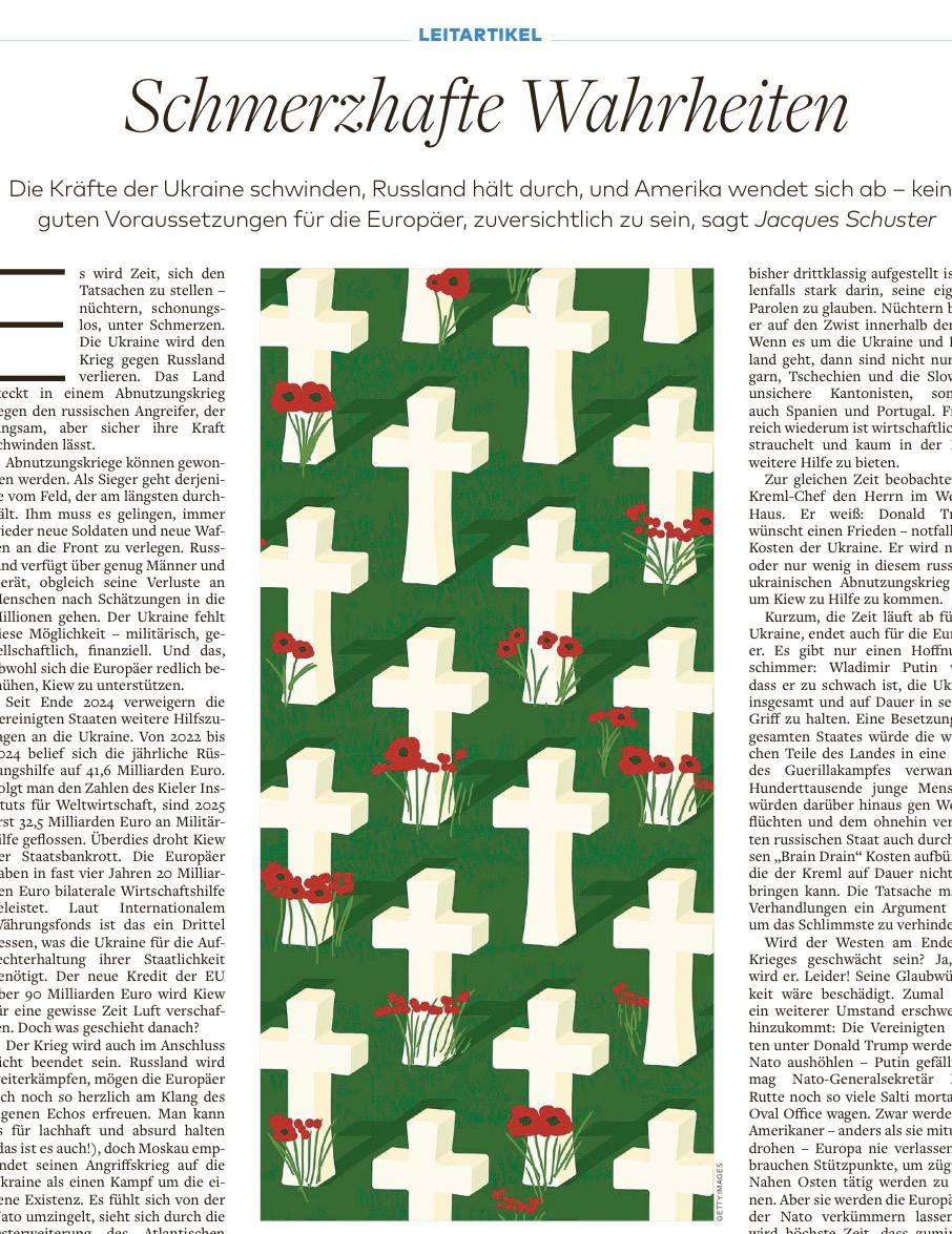 Пора взглянуть правде в глаза – трезво, безжалостно, болезненно. Украина проиграет войну против России. Страна застряла в войне на истощение против российского агрессора, которая медленно, но верно подрывает её силы. Войны на истощение можно выиграть. Победа достаётся тому, кто продержится дольше. Необходимо постоянно перебрасывать на фронт новых солдат и оружие. У России достаточно людей и техники... Украине этого не хватает – в военном, социальном и финансовом плане.