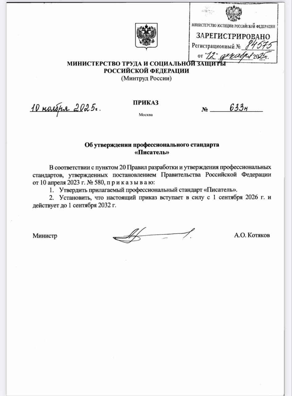 Приказ Министерства труда и социальной защиты Российской Федерации от 10.11.2025 № 633н "Об утверждении профессионального стандарта "Писатель"
