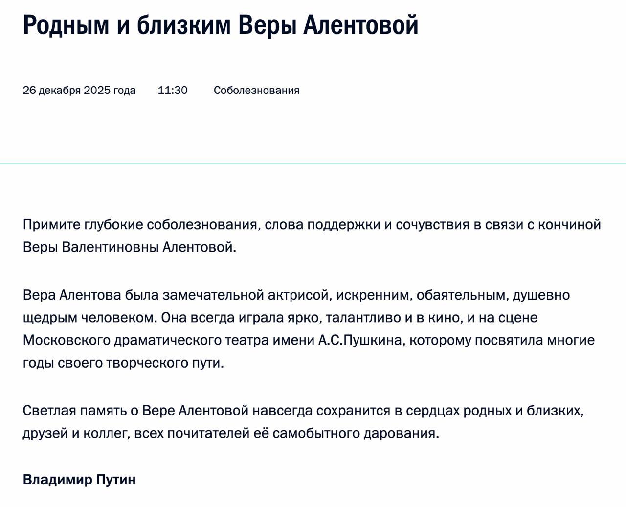 Владимир Путин выразил соболезнования родным и близким актрисы Веры Алентовой, которая скончалась накануне в возрасте 83 лет.