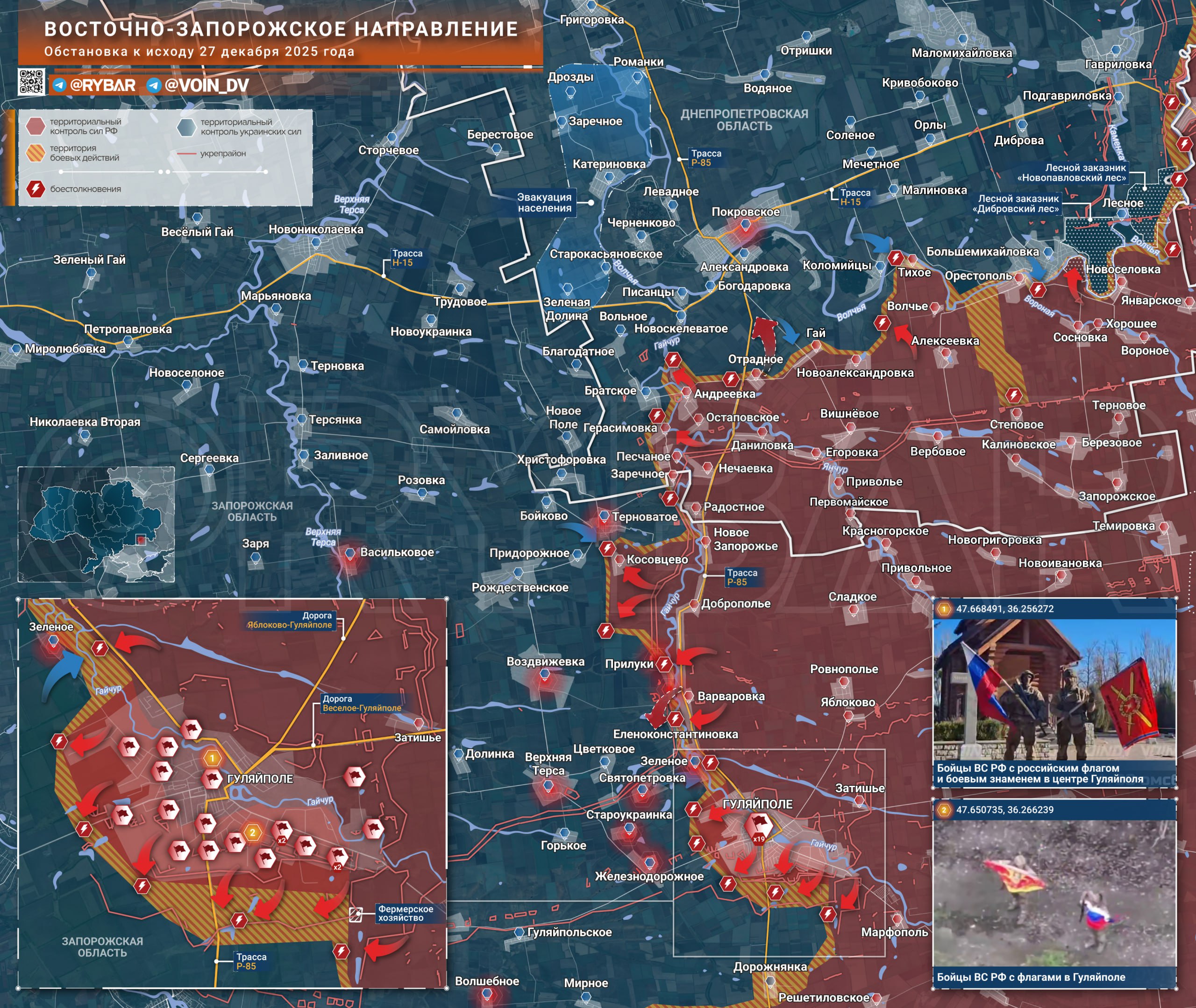 Спустя всего месяц ожесточенных боев пал один из главных форпостов ВСУ на Восточно-Запорожском направленииГуляйполе. Бои за него начались в ноябре, а уже 27 декабря Владимиру Путину доложили об окончательном освобождении города, что подтверждается кадрами объективного контроля с множеством флагов.