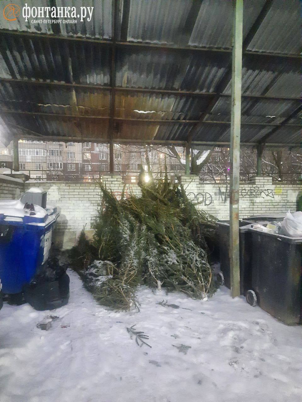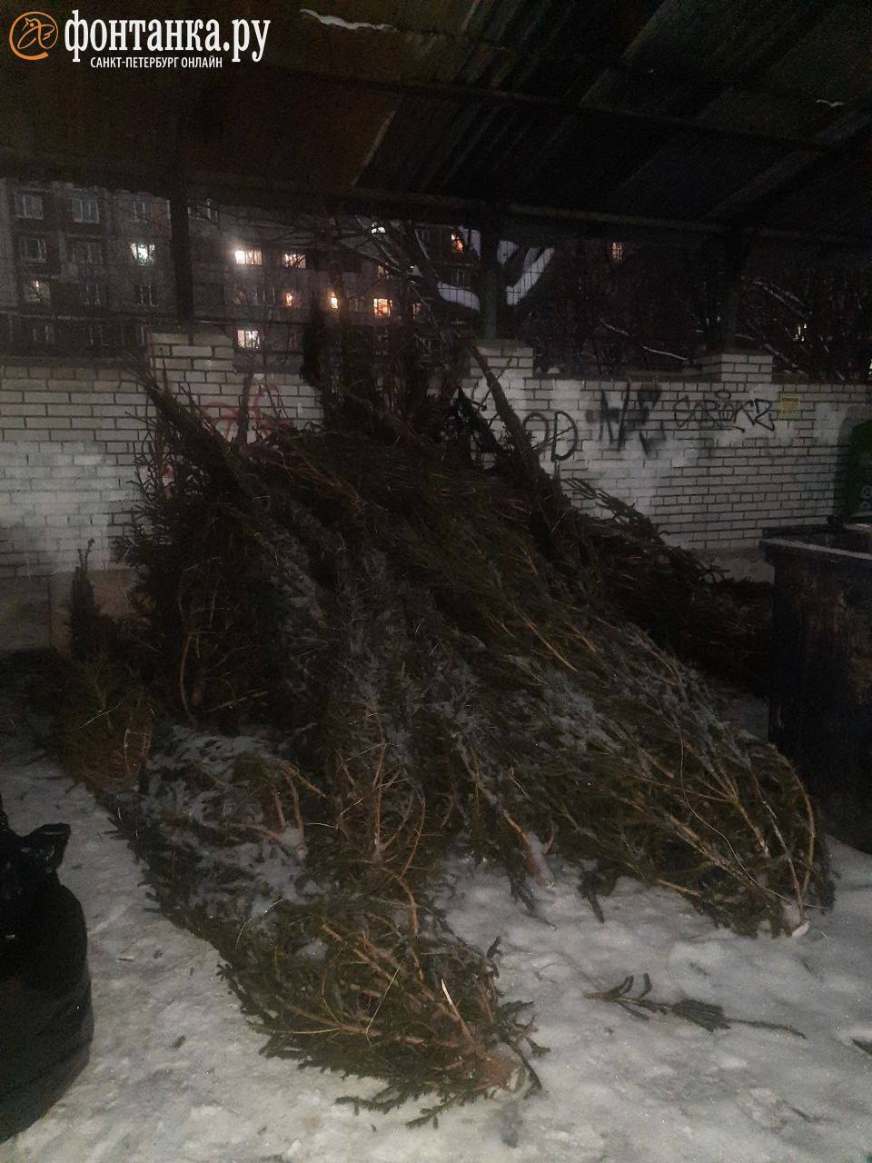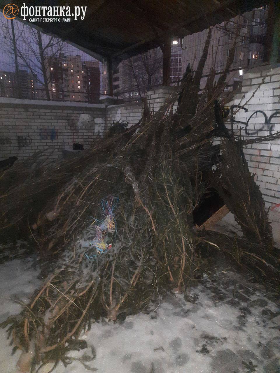 «Бессовестные торговцы ёлками свалили не менее 30 непроданных ёлок высотой 1,5-2м на контейнерной площадке Гаккелевской, 26», — рассказал петербуржец Михаил.