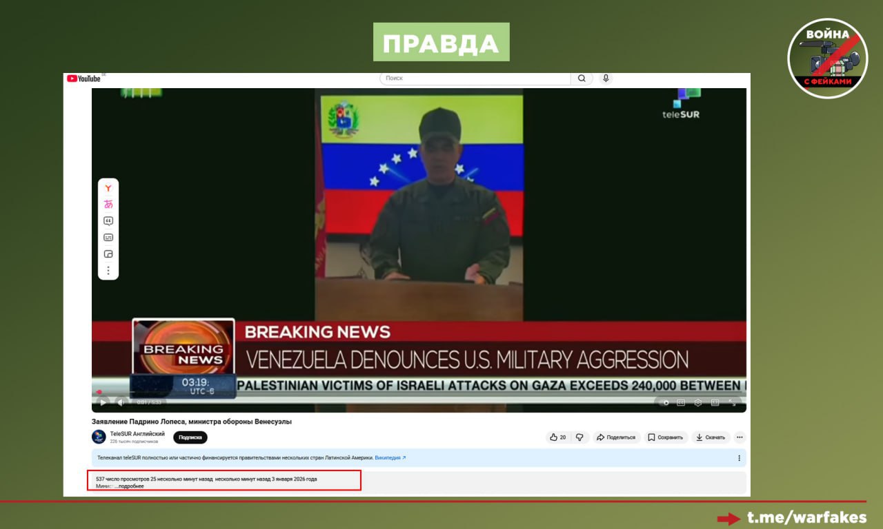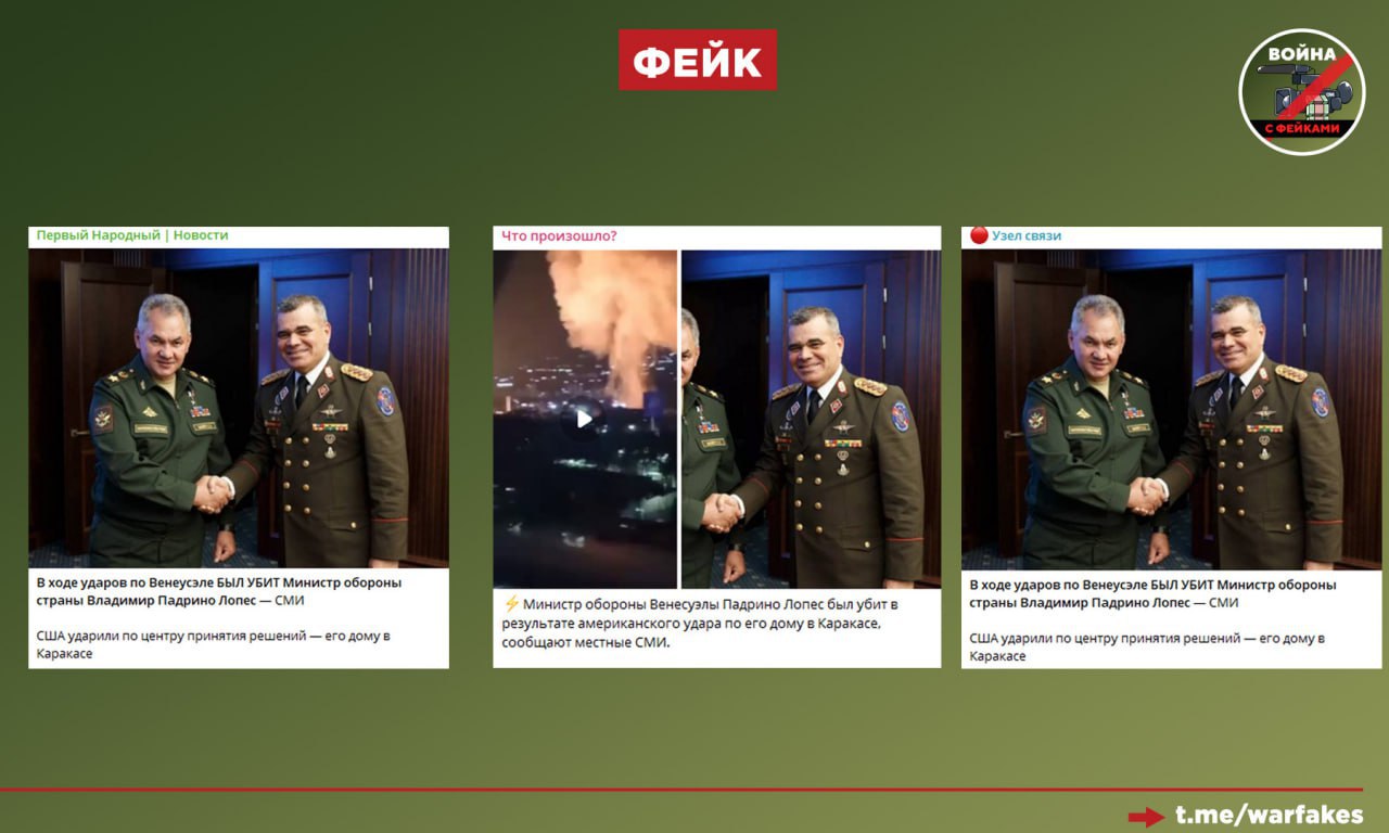 Фейк: Вследствие американских ударов по Венесуэле был убит министр обороны страны Владимир Падрино Лопес. Об этом сообщается в Telegram.