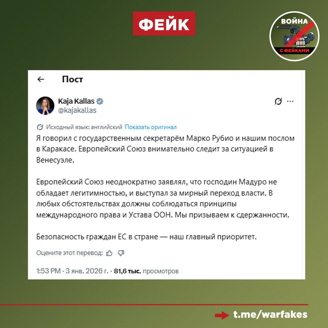 Фейк: Николас Мадуро — нелегитимный президент Венесуэлы. Об этом поспешила заявить глава евродипломатии Кая Каллас.