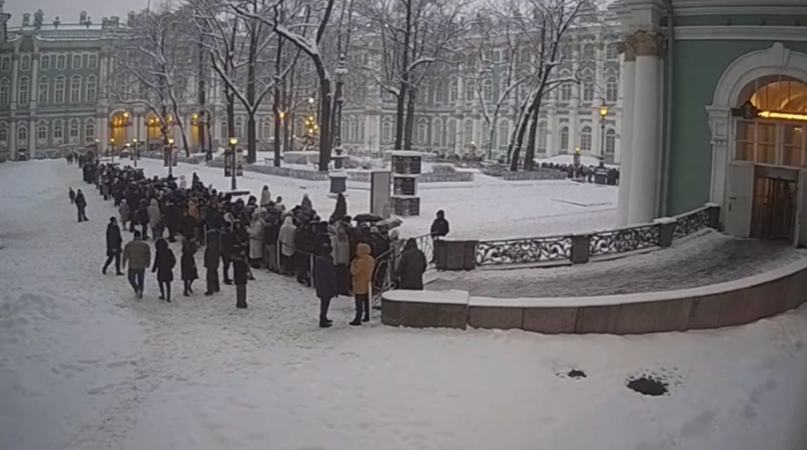 Очередь в Эрмитаж в Санкт-Петербурге растянулась с Дворцовой площади до Александровской колонны. Музей предлагает озябшим посетителем бесплатный горячий чай.