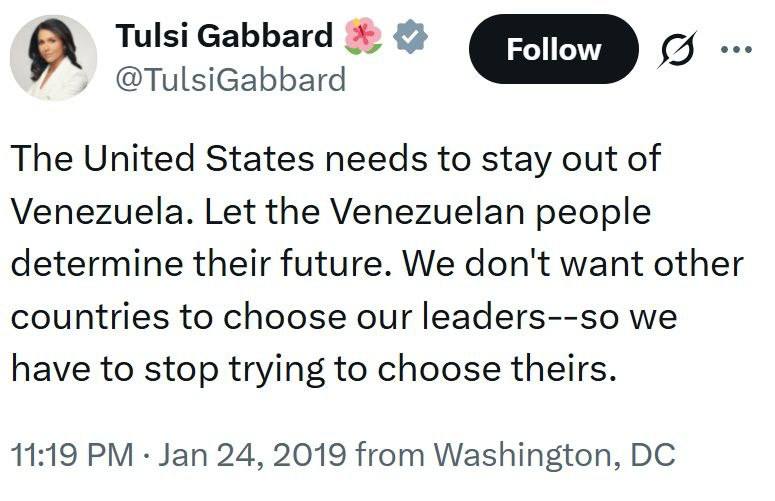 История немного напоминает сюжет с Ираном. В марте 2025 года Габбард, уже будучи главой разведки, докладывала, что весной этого года разведка не видела признаков изготовления Ираном ядерного оружия. А через 2,5 месяца именно подготовка США ядерного оружия стало формальной причиной ударов по нему США.
