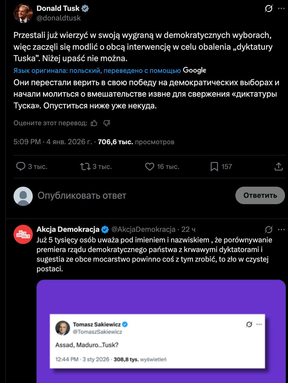 Дональд Туск в соцсети Х раскритиковал польскую оппозицию, которая предрекла ему судьбу, как у президента Венесуэлы Николаса Мадуро.
