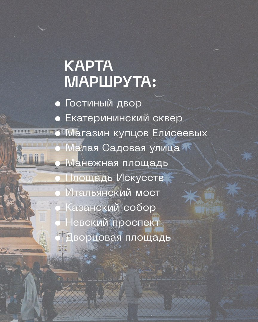 Пешеходный маршрут №8 начинается у Гостиного двора. Вы сможете прогуляться по Екатерининскому скверу, по пути на Рождественскую ярмарку на Манежной зайти в магазин купцов Елисеевых. На площади Искусств обязательно обратите внимание на памятник Пушкину, с которого в конце прошлого года после реставрации сняли строительные леса.