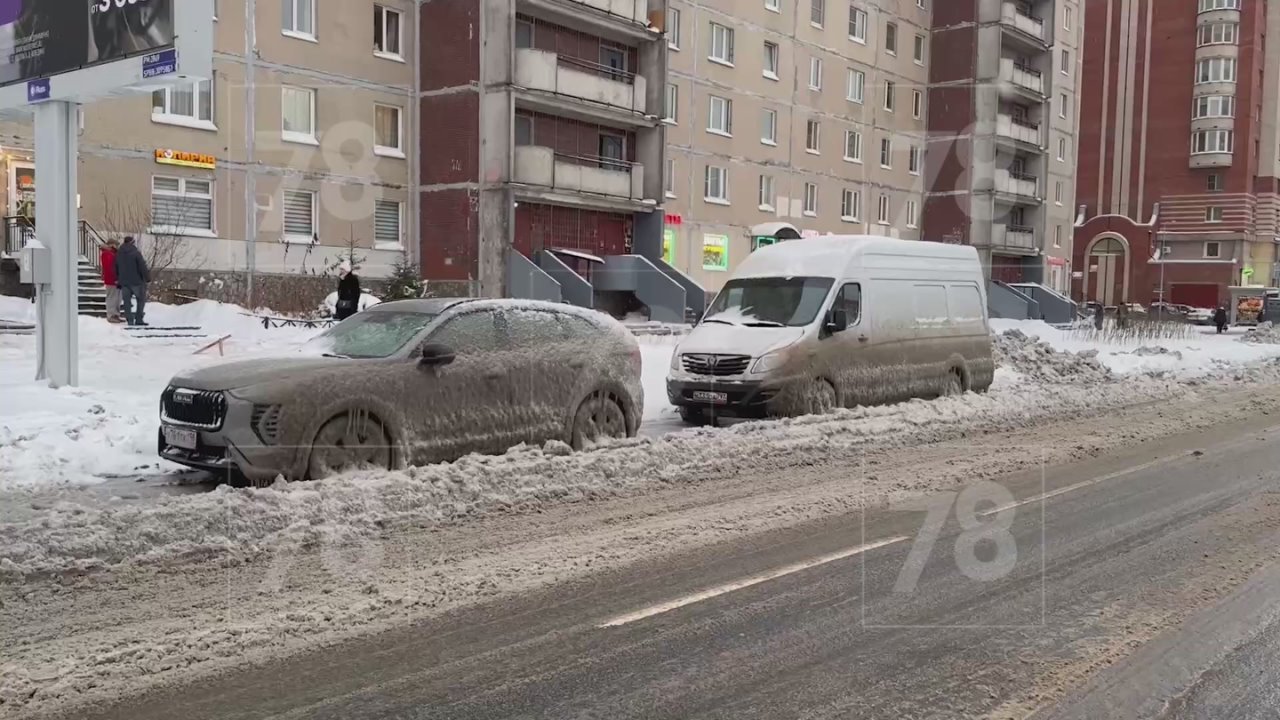 Минувшей ночью там прорвало трубу, пересечение с Пулковской улицей было затоплено. Припаркованные рядом машины покрылись ледяной коркой.