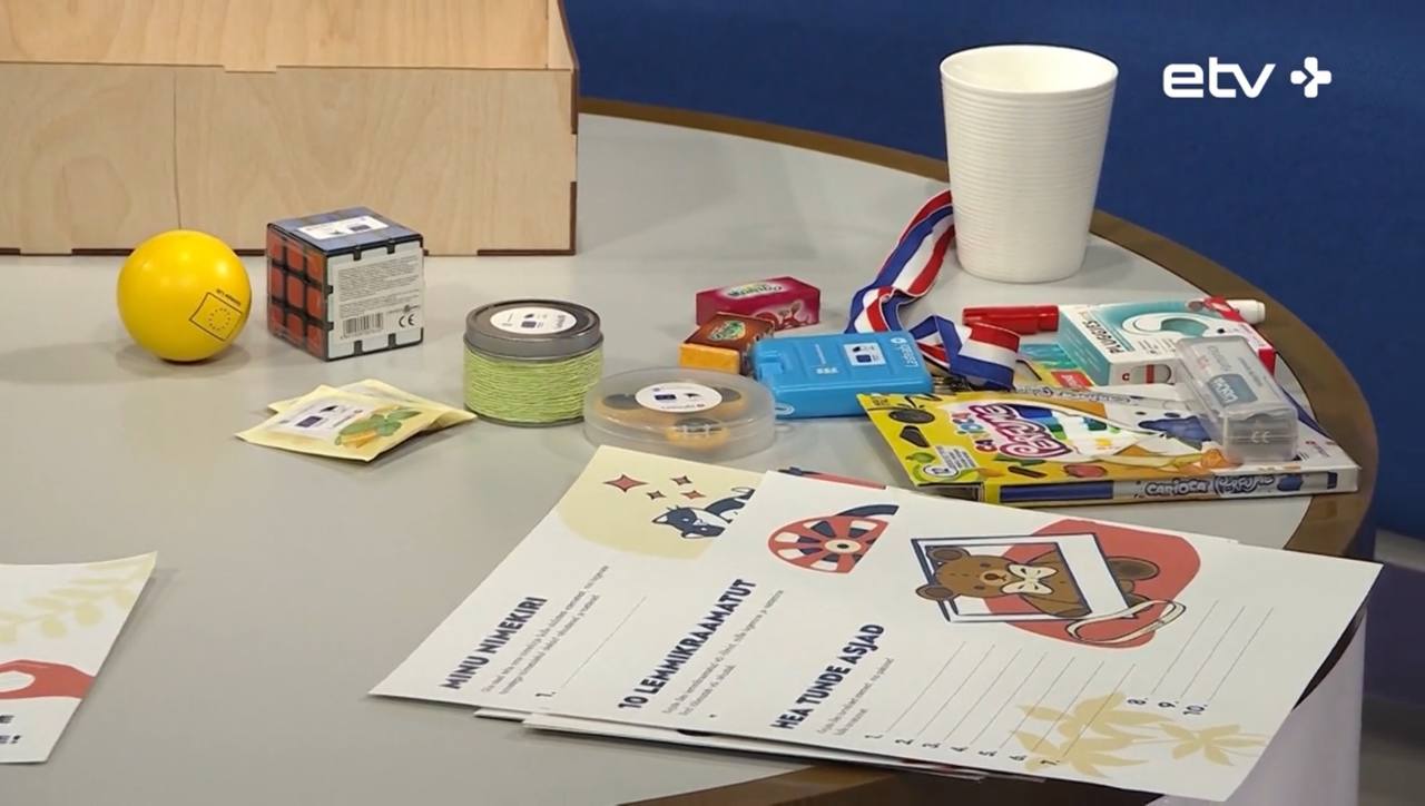 В образец входят: раскраска-мандала и другие рабочие листы, фломастеры, губная гармошка, ароматическая свеча, спиннер, кубик Рубика, мяч-антистресс, жевательные конфеты, беруши, грелка, золотая медаль, красный маркер.