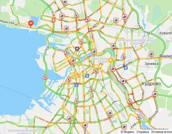 Самые проблемные места: проспект Косыгина и Октябрьская набережная с Малоохтинским проспектом. Однако на карте «красных» улиц гораздо больше.