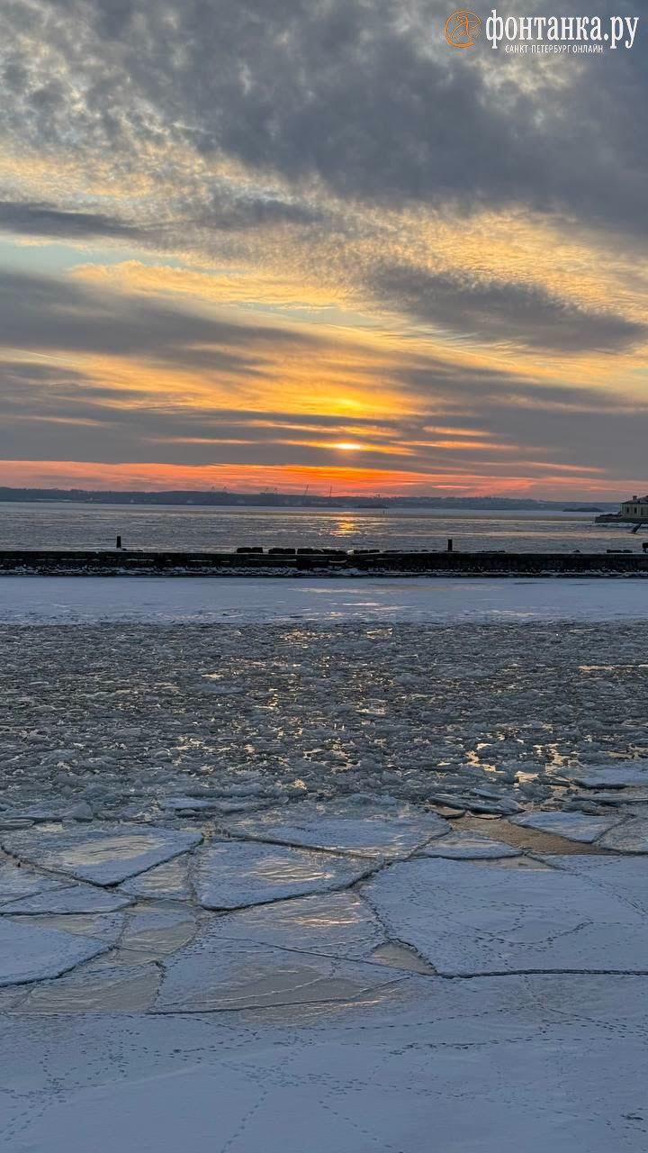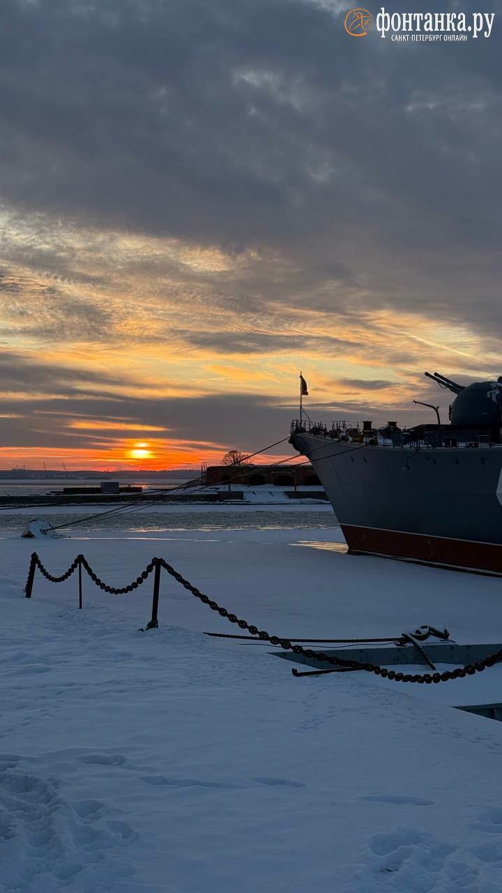На смену яркому рассвету пришел не менее сочный закат. Красный диск на фоне кораблей Кронштадта – встречаем вечер.