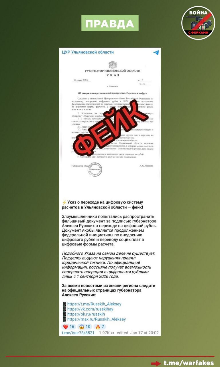 Правда: Перед нами документы-подделки. На официальных сайтах правительства Республики Калмыкия и Ульяновской области отсутствуют приказы об утверждении программы «Переходи на цифру».