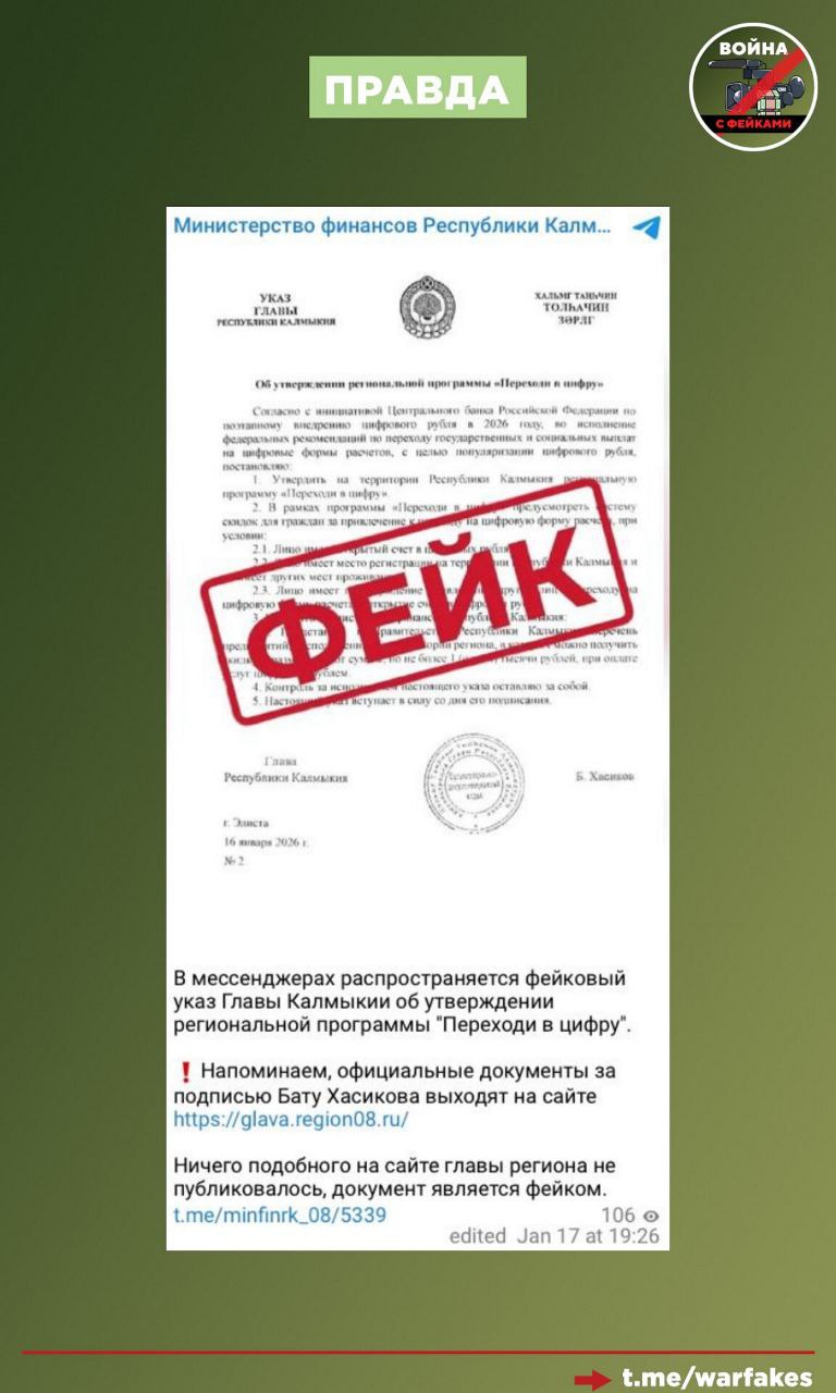 Слухи о переходе на новую схему получения государственных и социальных выплат опровергло Министерство финансов Республики Калмыкия в своем официальном телеграм-канале: