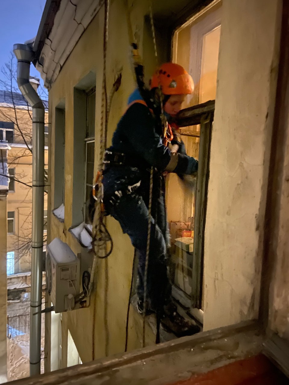 Квартира была заперта, и лишь приоткрытая на проветривание форточка оставляла надежду вытащить скребущуюся кошку из застенка. И спасатели ею воспользовались — подвесили кошколовку к окну и принялись выжидать на крыше. Там же вместе с ними выжидала полиция.