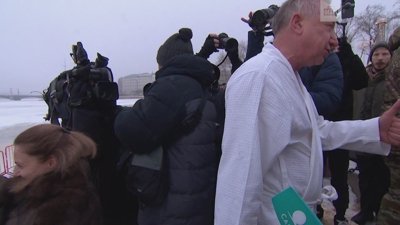 Одними из первых после чина освящения воды, который провел митрополит Варсонофий, в купель погрузились губернатор Александр Беглов и председатель Заксобрания Александр Бельский.