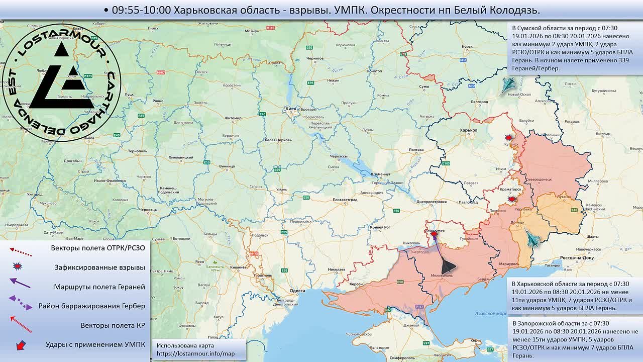 Анимированная схема ударов по территории Украины 19 января 2026 – 20 января 2026 года.
