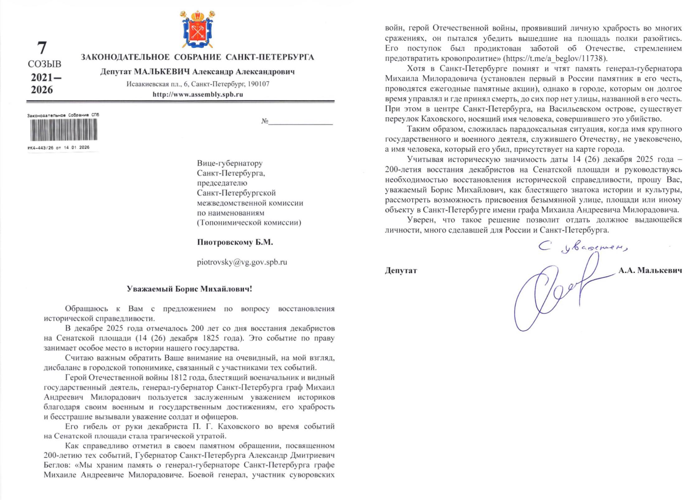 Как #депутат_Малькевич, я направил письмо вице-губернатору Санкт-Петербурга Борису Михайловичу Пиотровскому с просьбой рассмотреть возможность присвоения безымянной улице, площади или иному городскому объекту имени Милорадовича.