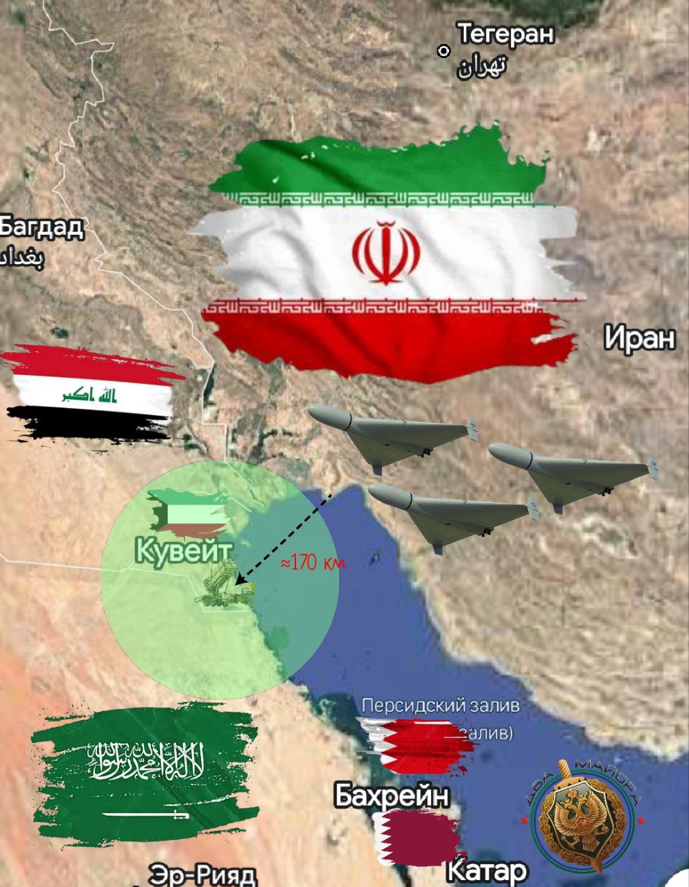 Кувейт расположен в 30 км от Ирана по суше и 170 км по морю (через Персидский залив).
