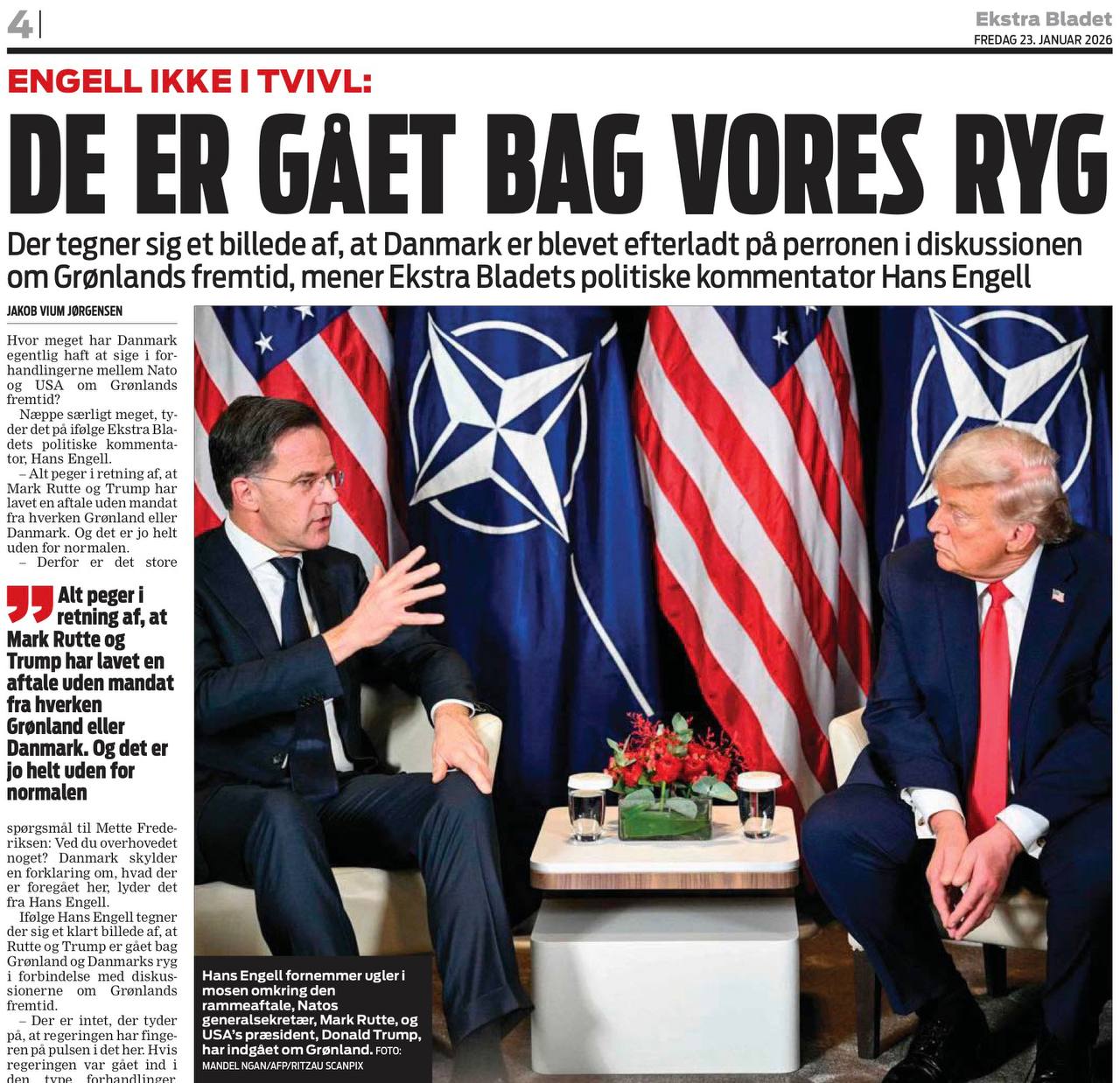 «Они действовали за нашей спиной». Датская газета Ekstra Bladet, шокированная сделкой Трампа и Рютте по Гренландии, пытается понять, какой мандат у них был для этого. Газета пишет: