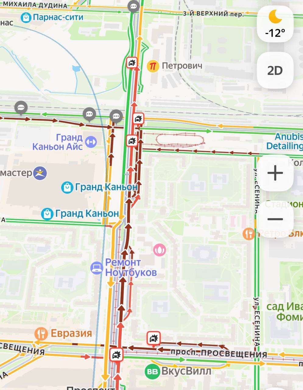 В общем у метро «Парнас» все «стоит наглухо», а «мост полностью перекрыт», делятся водители.