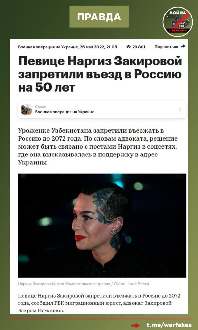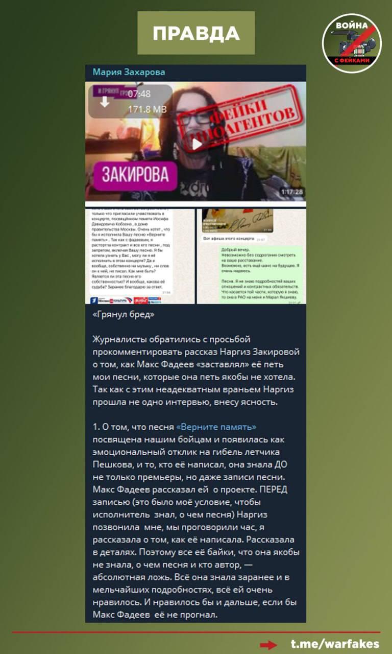 Правда: Заявление Наргиз — пример того, как оппозиционные издания и их спикеры жонглируют фактами. Исполнительница знала, кто написал стихи на песню «Верните память». Сама песня Наргиз нравилась и не вызвала вопросов ровно до того момента, пока Максим Фадеев не разорвал с ней деловые отношения. Об этом рассказала в своем телеграм-канале Мария Захарова, подкрепив позицию скринами переписки с певицей.