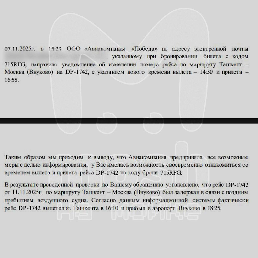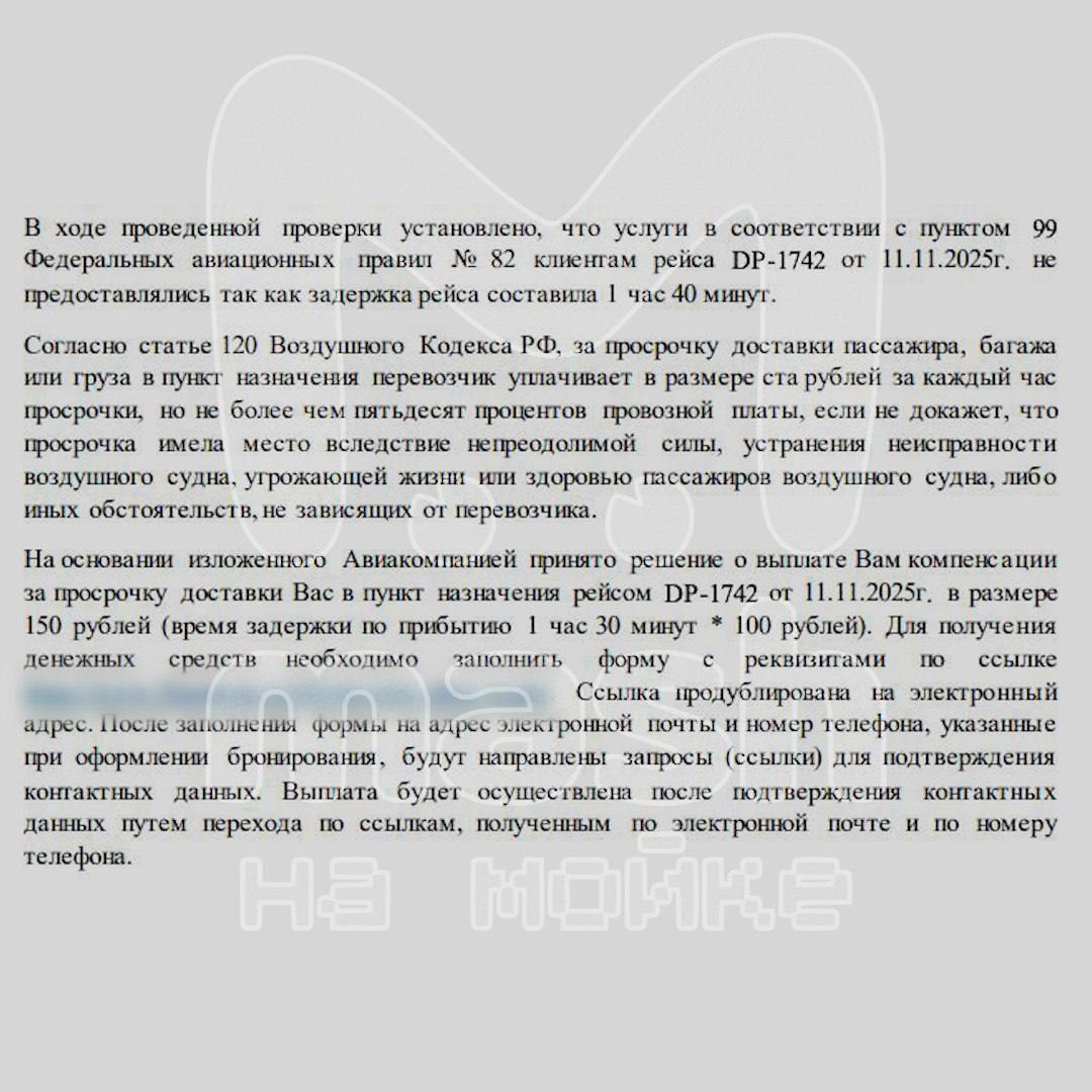 Щедрую компенсацию в 150 рублей обещает нашим питерским подписчикам авиакомпания "Победа" — за перенос рейса Ташкент – Москва на 13 часов. Перевозчик сообщил об изменениях за несколько дней до вылета из Узбекистана (был пересадочным пунктом), но в предоставлении проживания отказал.