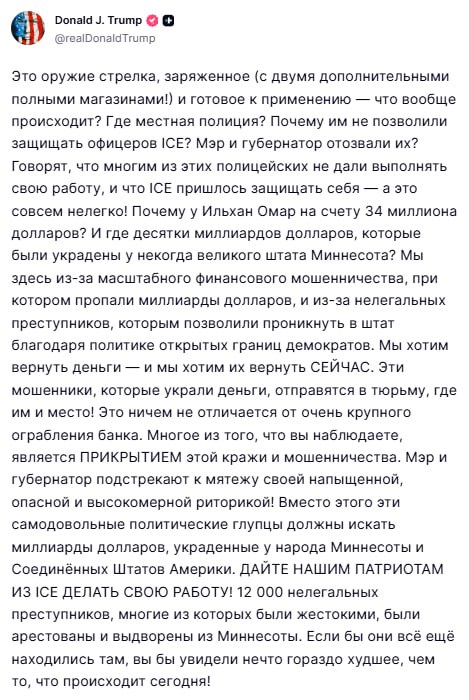 «Демократы заблокируют законопроект о расходах правительства после гибели мужчины в результате огня служащего пограничного патруля в Миннеаполисе… что сильно повышает вероятность частичного шатдауна правительства на следующей неделе»,
