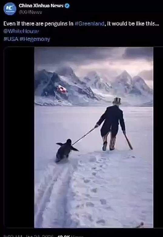А вот так китайское Xinhua визуализировало фото Трампа с пингвином в Гренландии.