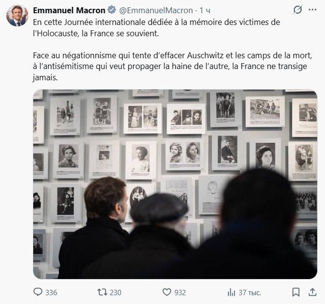 Тем временем Макрон: ‘Столкнувшись с отрицанием, стремящимся стереть из памяти Освенцим и лагеря смерти, Франция никогда не идет на компромиссы’.