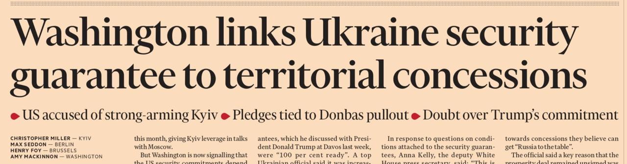 Первая полоса сегодняшней Financial Times: «Вашингтон связывает гарантии безопасности Украине с территориальными уступками». Речь о том, что США якобы требуют от Киева согласиться на условие России и вывести ВСУ за пределы Донбасса. Газета ссылается на «восемь источников, знакомых с ходом переговоров».