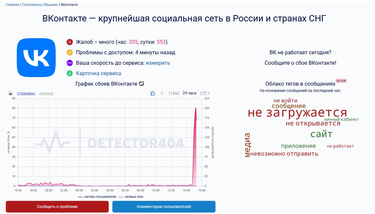 За последний час зафиксировано 355 жалоб. Сообщается, что сайт и приложение не загружаются.