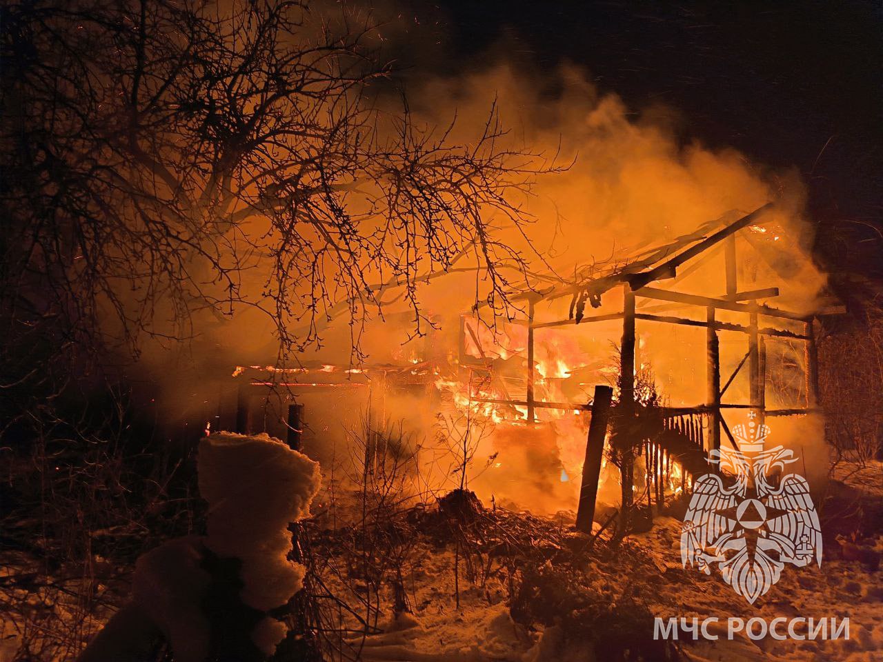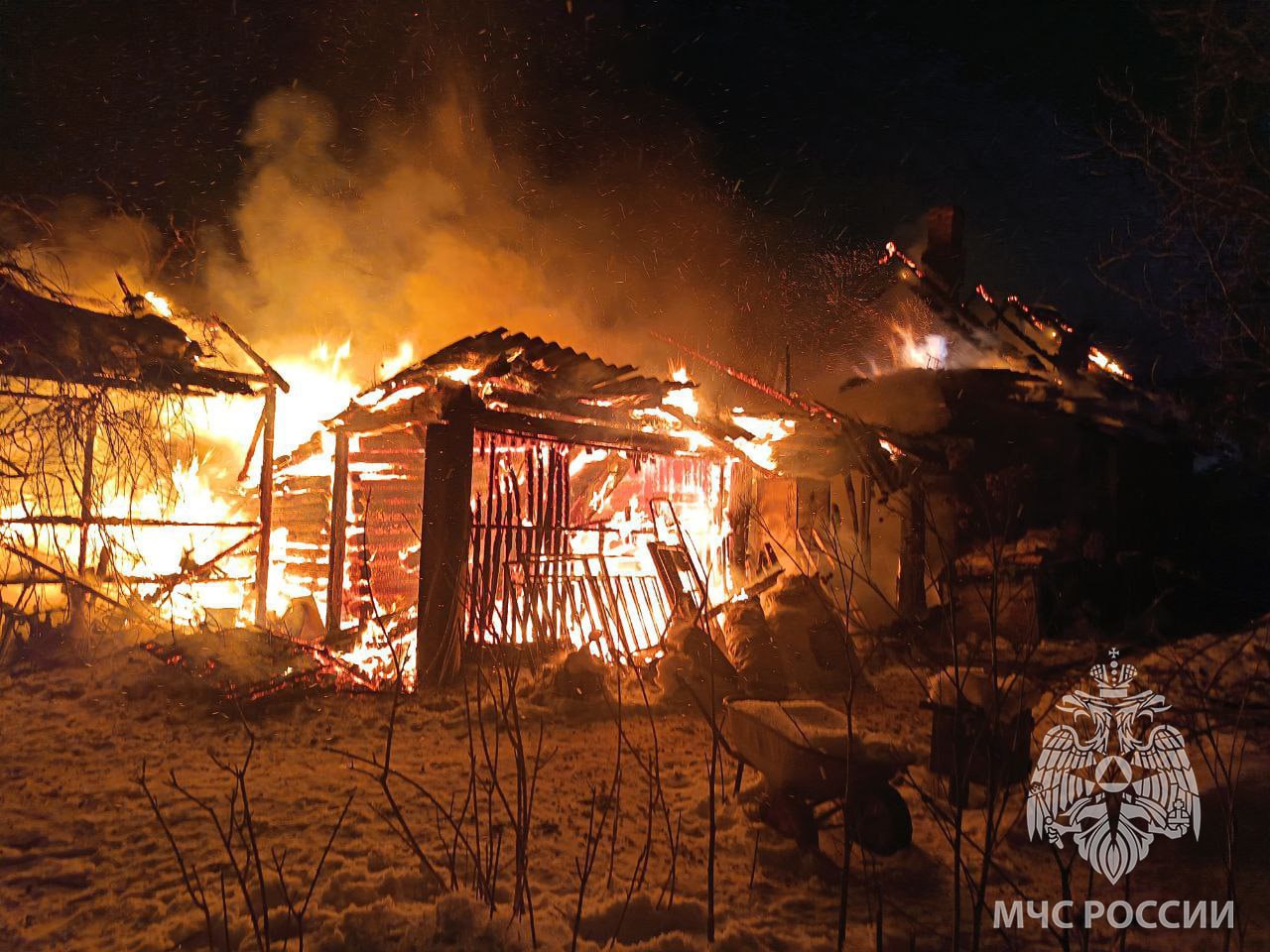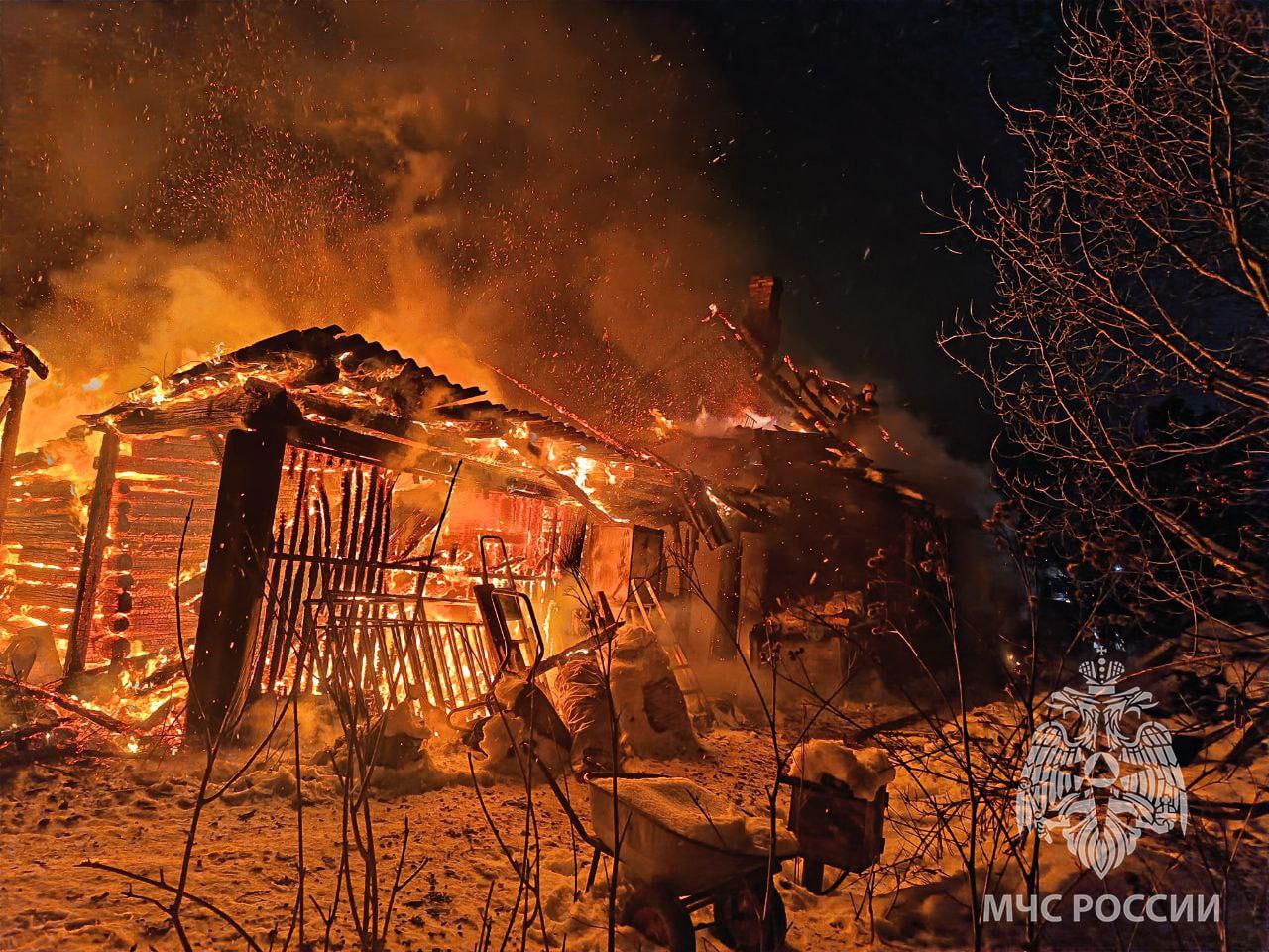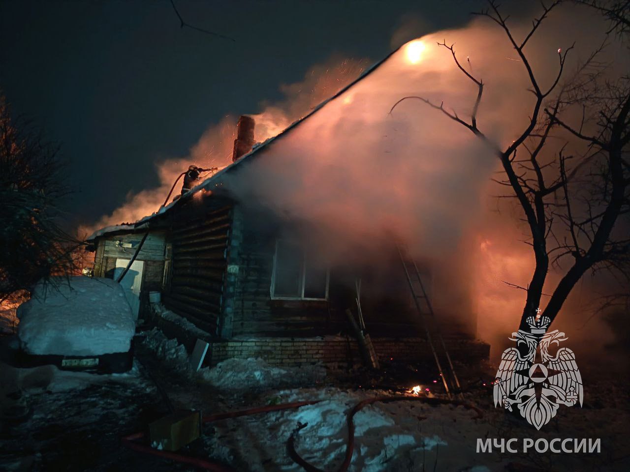 Спасатели тушат огонь в одноэтажном рубленом доме и пристройке к нему. Общая площадь пожара составила 96 кв. метров. Сведений о пострадавших людях не поступало.