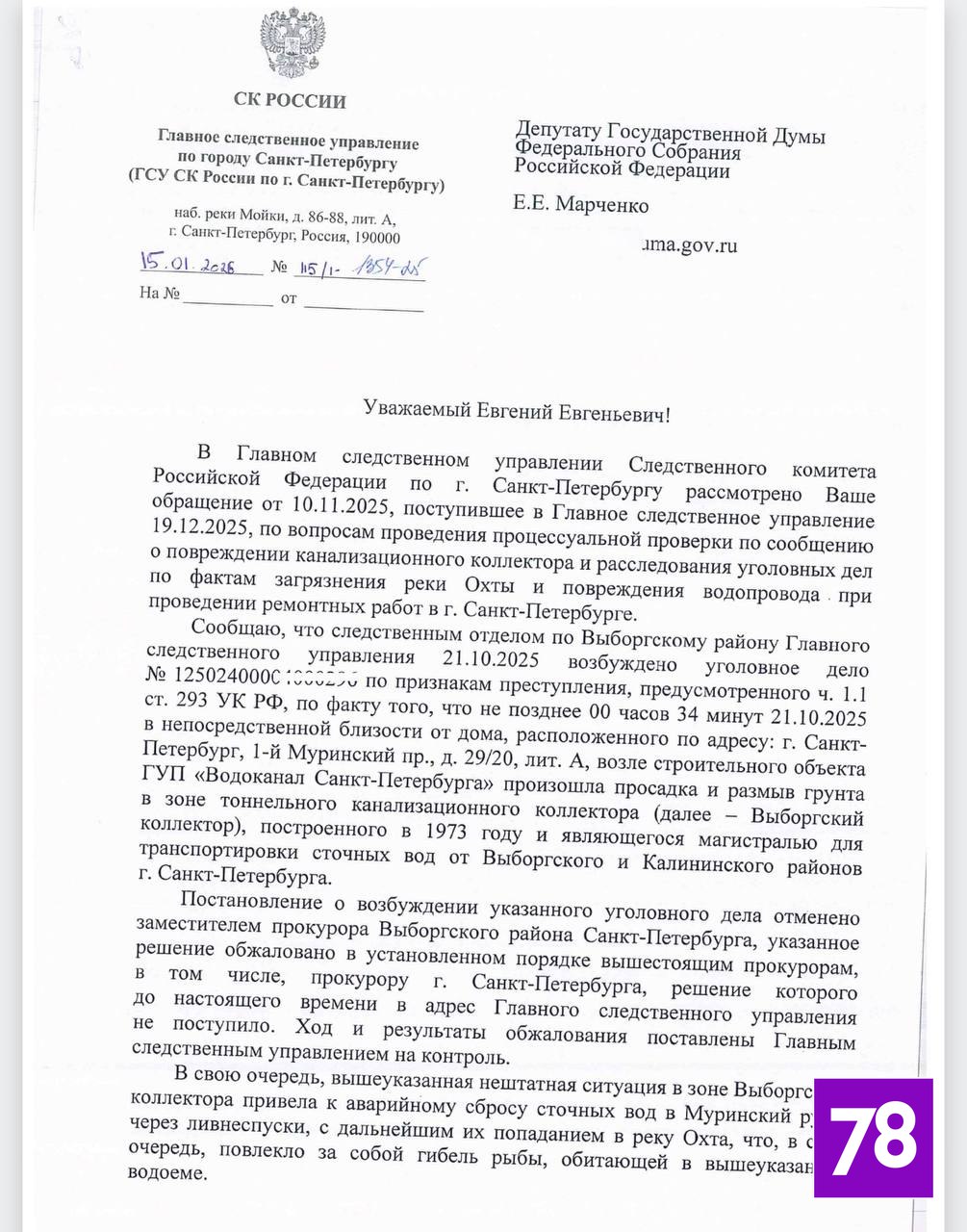Это следует из ответа СК депутату Госдумы РФ Евгению Марченко. Дело по статье о халатности было возбуждено после прорыва коллектора и провала грунта на улице Харченко.