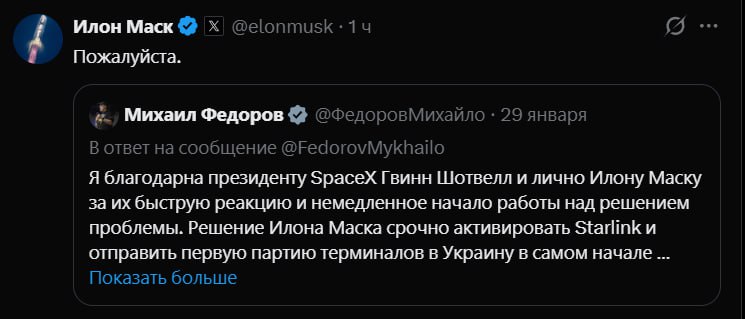 Илон Маск подтвердил начало выработки мер противодействия использованию старлинка на российских беспилотниках. Перевод машинный.