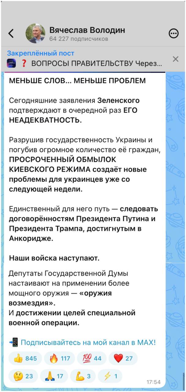 Пост уважаемого спикера Госдумы Вячеслава Володина написан в стиле уважаемого Дмитрия Медведева жёсткие формулировки, капслок.