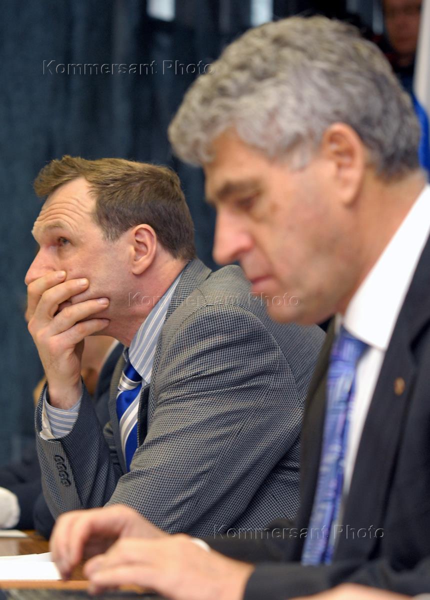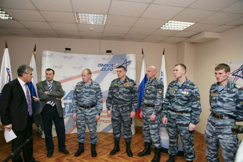 Сопредседатели партии «Правое дело» Георгий Бовт и Леонид Гозман награждают сотрудников ОМОН, участвовавших в разгоне протестов на Манежной площади. Москва, 25 марта 2011 года.