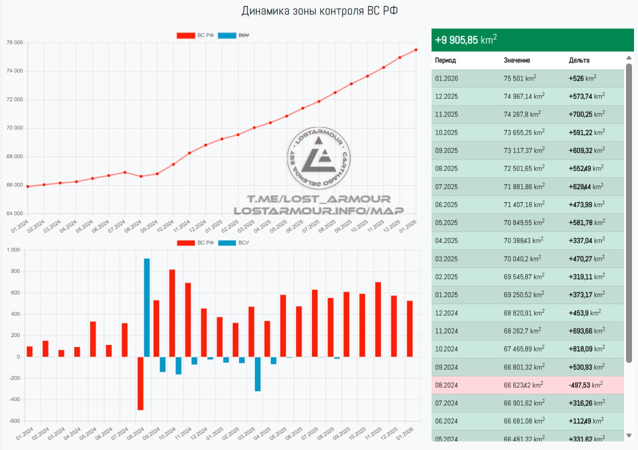 Вооруженные силы Российской Федерации в январе 2026 года освободили 526 км территории в зоне СВО, что на 41% больше чем годом ранее в январе 2025 (373 км), и более чем в 5 раз больше чем в январе 2024 (99 км).