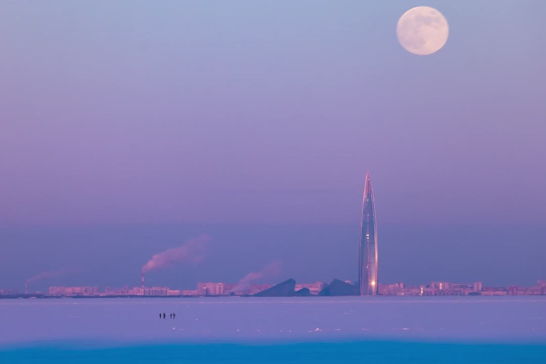 Снежную Луну лучше всего видно вечером или утром на горизонте. Это видео снято у «Лахта Центра».
