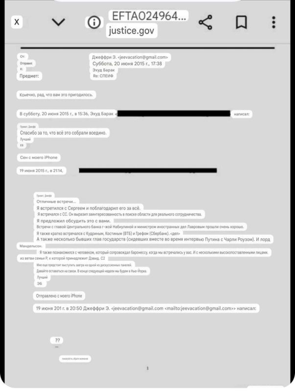 В документах Эпштейна всплыло письмо бывшего премьер-министра Израиля Эхуда Барака, где он отчитывается перед Эпштейном о своих встречах с Лавровым, Набиуллиной, Грефом и Костиным.