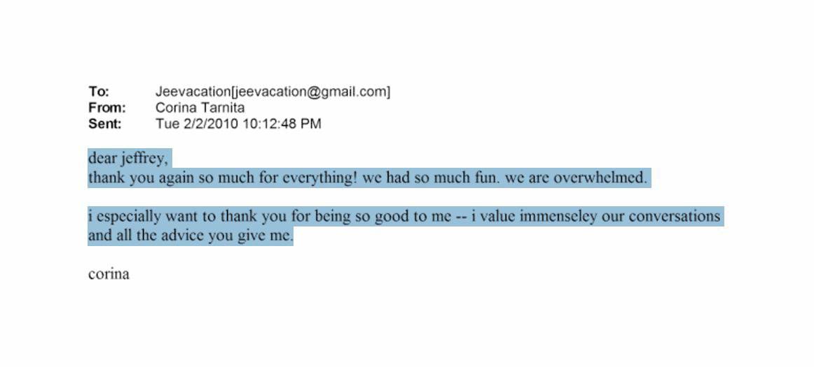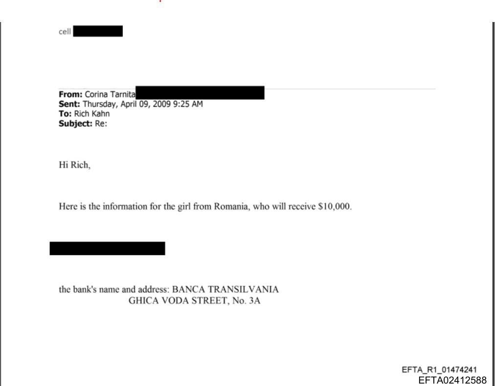 Например, в апреле 2009-го речь шла о выплате аж десяти тысяч долларов одной студентке из города Яссы. Тарницэ не стала отпираться и призналась, что действительно общалась с Эпштейном с 2008 по 2012 годы. Однако, по её словам, деньги шли исключительно на поддержку одарённых молодых учёных.