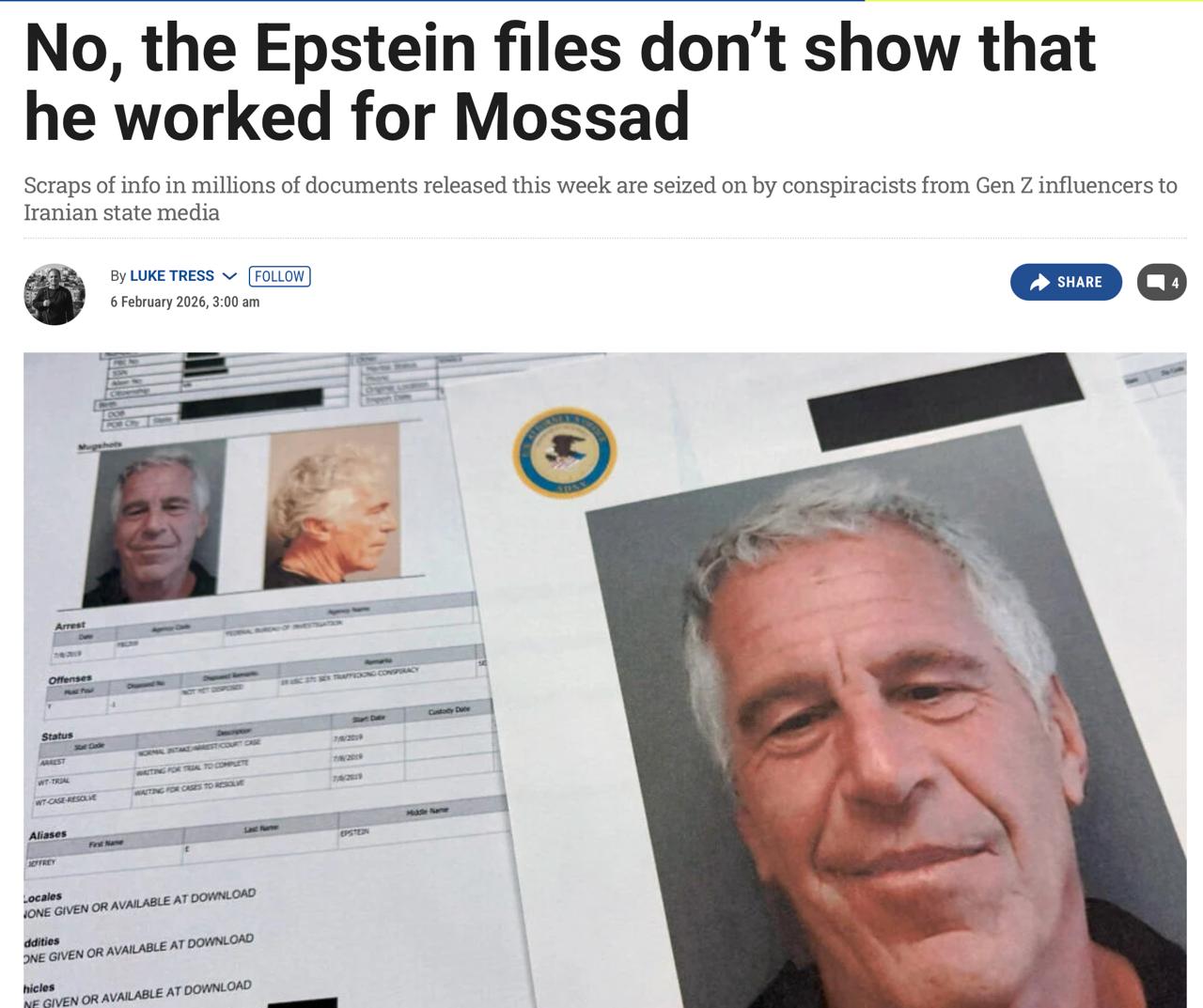 При этом параллельно продвигается тема Нет, файлы Эпштейна не показывают, что он работал на Моссад. В той же статье The Times вскользь упоминается: Также поступали утверждения о том, что Эпштейн работал на Моссад, но доказательства этому гораздо менее убедительны. Ну, конечно, тот факт, что он работал на КГБ, гораздо более достоверны, как же!