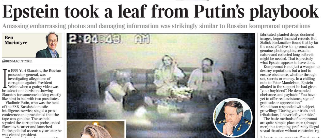 Да, я гляжу тема о работе Эпштейна на Россию стала раскручиваться с неимоверной силой в мейнстримных СМИ Запада. Вон, к примеру, The Times сегодня даже видео бывшего генпрокурора Скуратова в этой связи вспомнила - как будто на Западе мало случаев компрометации политиков таким образом.