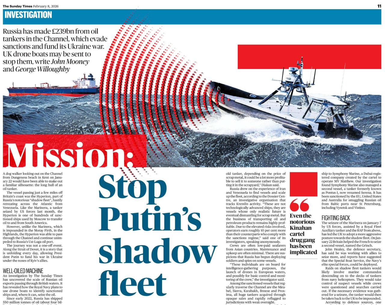 Из предлагаемого командного центра теневого флота Великобритания будет отслеживать, собирать разведывательную информацию и, возможно, перехватывать санкционированные суда во время их прохождения. HMS Calliope, учебный центр, используемый военно-морским резервом в Гейтсхеде, будет преобразован в базу, с которой флотилия беспилотных катеров будет отправляться в Северное море или Ла-Манш и управляться с расстояния в сотни миль. Эти беспилотные надводные суда закупаются, но по конструкции они будут похожи на семиметровые катера Rattler, которые недавно испытывались у побережья Шотландии, управляемые с расстояния в 500 миль из Портсмута. Эти катера, оснащенные технологиями наблюдения, будут следить за российским танкером, помогая выявлять суда, плавающие под ложным флагом или названием. Есть надежда, что к тому времени, когда танкер из теневого флота достигнет Ла-Манша, Министерство обороны соберет достаточно информации, чтобы определить, можно ли законно захватить судно.
