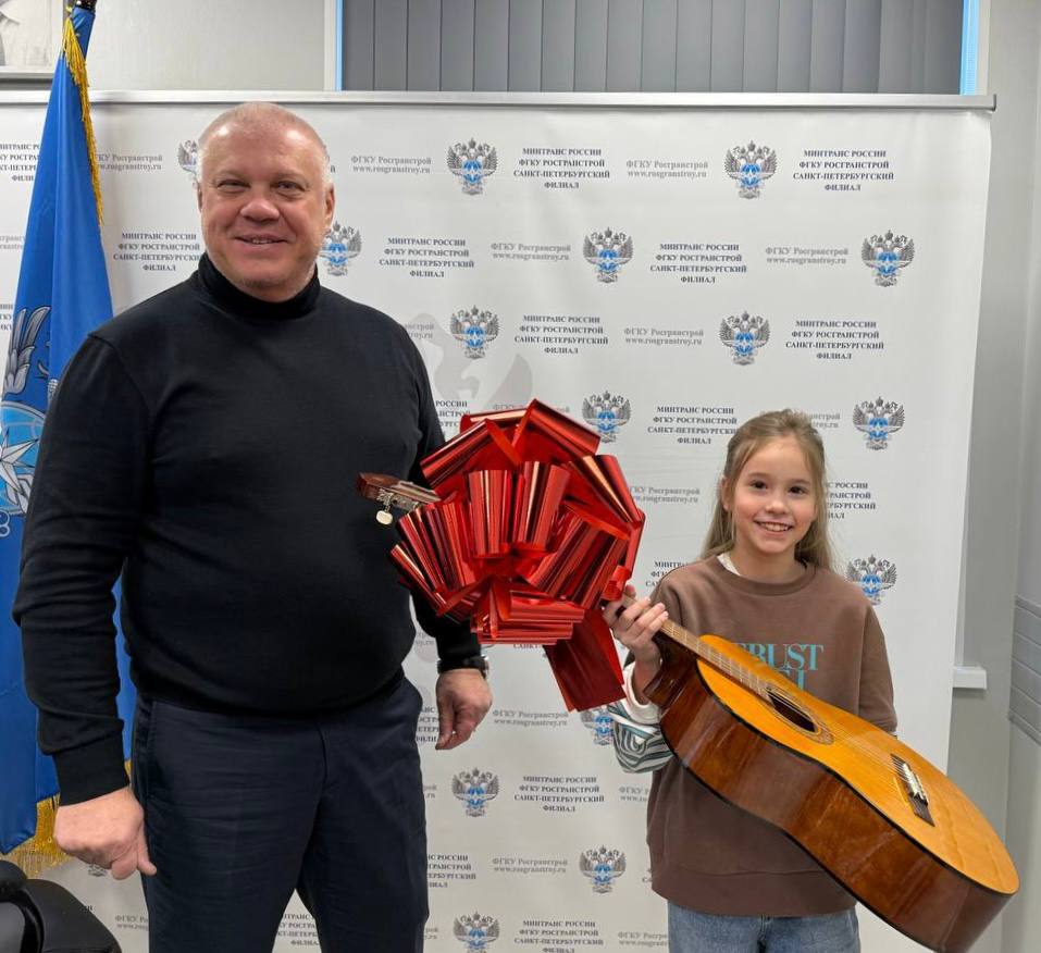 Для получения подарка семья Кати приехала в гости в офис Санкт-Петербургского филиала Росгранстроя. Родители девочки рассказали, что она учится в 4 классе и совсем недавно у нее появилась мечта научиться играть на гитаре