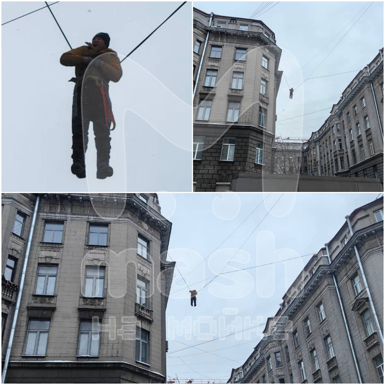 Дворник сорвался с крыши повис на проводах дома на улице Правды — прохожие фоткают бедолагу и страшно переживают, пока к нему спешат на помощь службы
