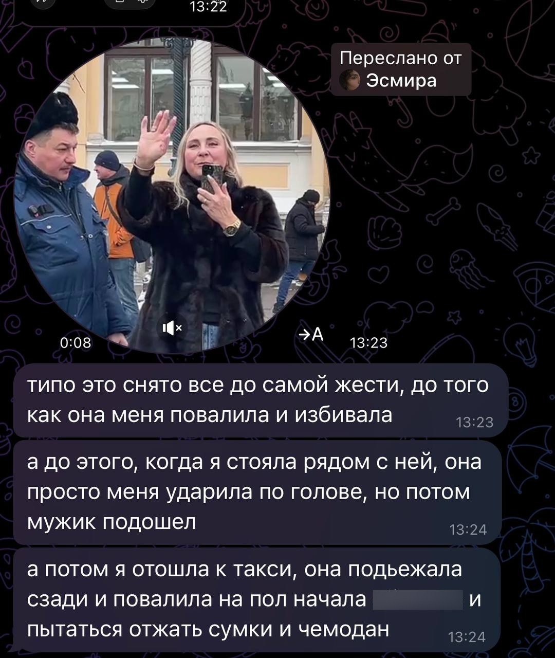По словам Эсмиры, к ней подошла женщина и попыталась отобрать чемодан с сумками говорила, что это её. После этого она ударила девушку по голове, повалила на землю и продолжила избивать, дергать за волосы.