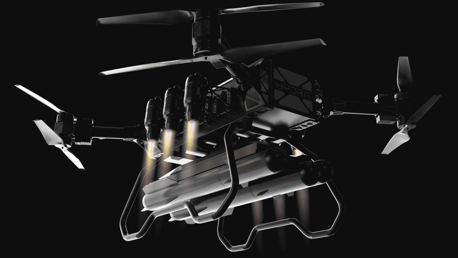 В основе HYDRA-400 лежит гибридная силовая установка: 8 электромоторов (винты) + до 6 небольших турбореактивных двигателей. Это обеспечивает внушительную грузоподъёмность в 400 кг и сочетается с возможностью транспортировки дрона в кузове пикапа.